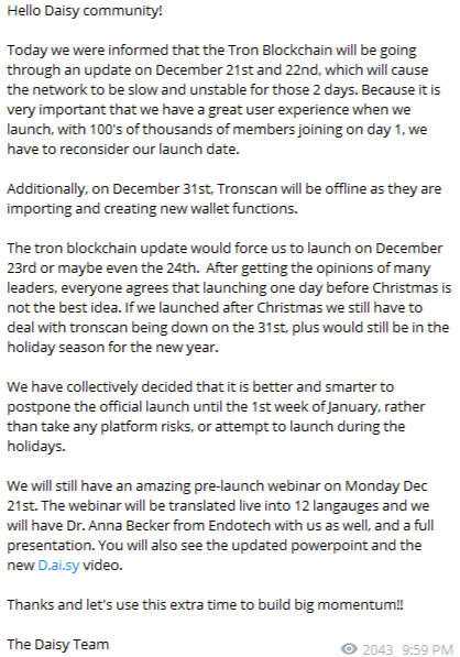 **Latest Updates Jan 10th 3 pm ESTDaisy Official Channel, [10.01.21 13:55] (https://t.me/daisy_global)UPDATE!!Most important, the only issue we are facing is the website reporting. SMART CONTRACT AND TRADING ARE 100% SOLID, ALL FUNDS ARE SAFE AND WORKING PROPERLY WITH ZERO ISSUES, AND ALL PAYOUTS AS WELL.We expected 100k members on day 1, we DID NOT expect 100k members in 10 minutes!! We have experts working 24/7 to perfect the website reporting.FOR NOW: Website login and registration is live, but here are some important tips:1) if ur referral link says daisy.global/r/undefined just replace undefined with your username2) back office reporting may show inaccurate numbers and may sometimes show that packs are not purchased, or may not let you purchase the next pack.Any backoffice issues require you to refresh the page (maybe multiple times) or logout (top right corner) and log back in.We are currently working to #1 minimize the back office reports in order to minimize the data overload short term, and #2 fixing the core website issues to handle our growth long term.These core fixes will take 3 to 5 days, and the short-term fixes should be seen through the day today.FOLLOW THE STEPS BELOW👇🏻
